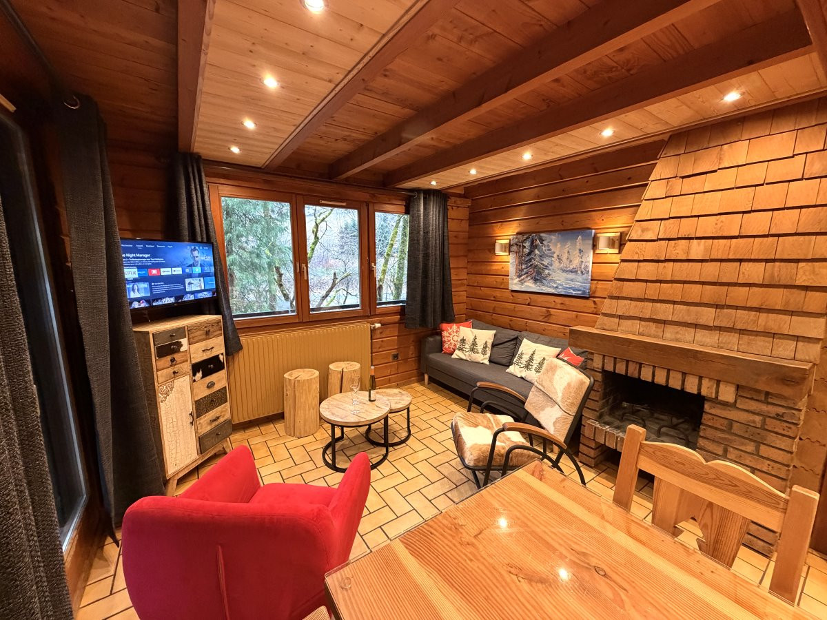 • Salon/Séjour : Espace chaleureux avec canapé confortable, cheminée, télévision à écran plat Smart TV connectée et coin repas, idéal pour se détendre en famille ou entre amis