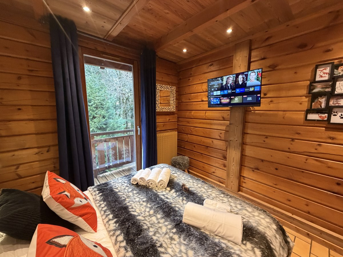 Ce chalet en rondin de 52 m² et pouvant accueillir de 2 à 6 personnes vous ravira pour sa vue sur les montagnes vosgiennes à 805 mètres d’altitude mais aussi pour sa décoration sur le thème des cerfs. Au rez-de-chaussée, vous trouverez 2 chambres. L’étage est composé d’une chambre et d’une mezzanine. Vous pourrez profiter de la cheminée et d’un extérieur avec SPA Jacuzzi privé ouvert toute l'année pour des moments de détente en pleine nature à la vue imprenable.